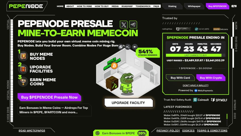 What makes PEPENODE stand out is its mine-to-earn virtual ecosystem. Instead of passive holding, users can build digital server rooms using Miner Nodes and facilities, earning simulated rewards through a visual dashboard. The concept brings gamification and competition into the meme coin space, giving holders something to do before launch.