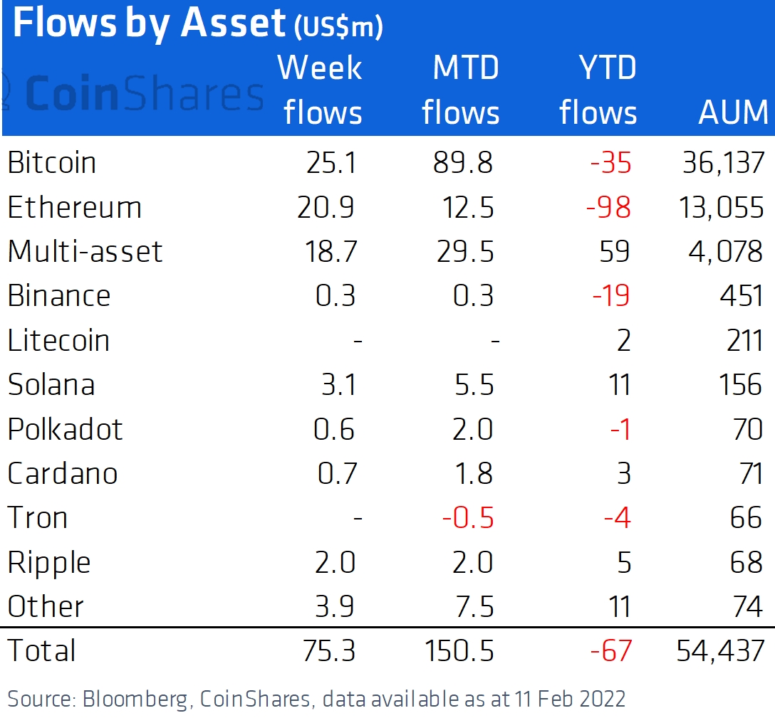 - Digital asset investment products saw inflows totaling USD 75m last week, marking the 4th week of inflows totaling USD 209m, according to CoinShares. Bitcoin still leads the inflows with USD 25m last week (USD 71m a weak earlier), while investment products flows for ethereum (ETH) finally broke its 9-week string of outflows with inflows totaling USD 21m last week (USD 8.5m in outflows a week earlier), per CoinShares.