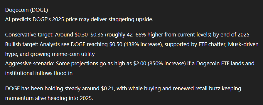 Everyone loves memes and memecoins, right? ChatGPT, too, is calling for a roughly 66% higher price for Dogecoin (DOGE) by the end of 2025.