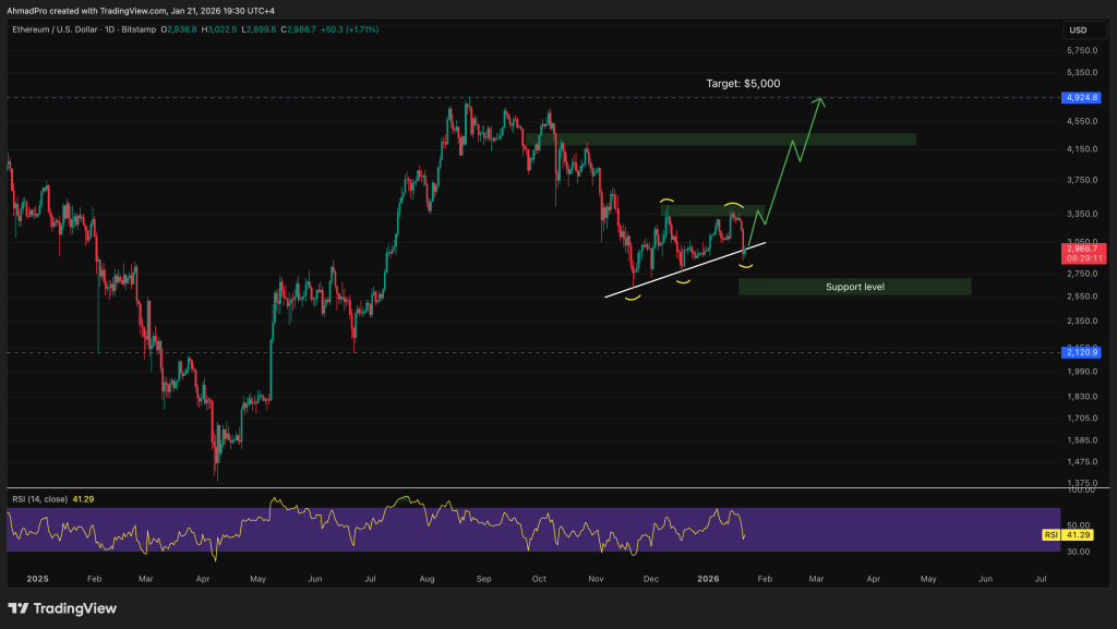 When Bitcoin is down, the rest of the market usually follows, and Ethereum is no exception. ETH is currently trading below $3,000, which puts the higher lows structure it has been building at risk.