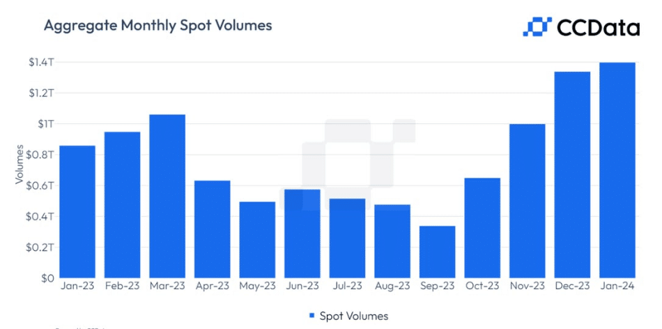 In January, the digital asset spot trading volumes on centralized exchanges increased by 4.45% to $1.4 trillion, recording the fourth consecutive increase in monthly spot trading volumes, according to the latest market report from on-chain analytics firm CCData.