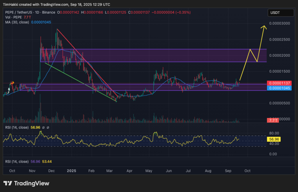 Currently priced at $0.0000113, Pepe has risen 4% overnight in step with an 4% rise across the now $90.8 billion meme coin sector. Furthermore the token gained 7% over the past week, outperforming Bitcoin, Ethereum, XRP, Solana, and Shiba Inu.