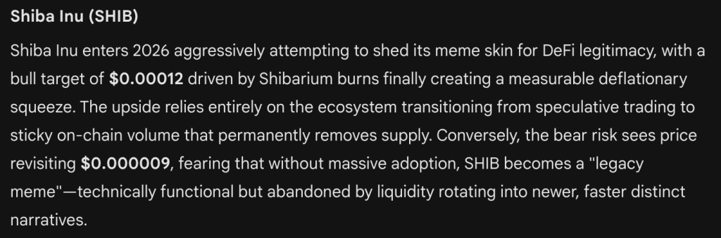However, Gemini crowns it as the meme king and says it’s just resetting for a “Phase 2” expansion, targeting a bull run to $0.000018. Also saying it’s too big to fail and the primary leverage vehicle for Ethereum beta.