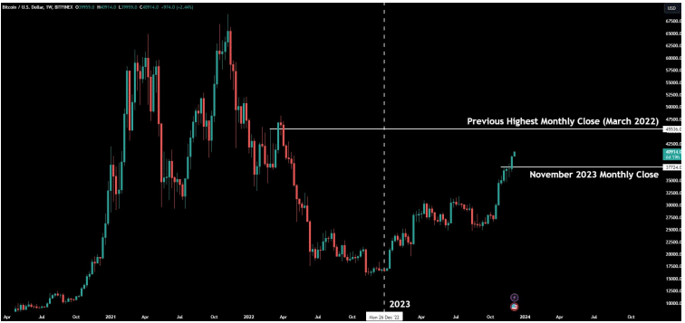Meanwhile, Bitcoin (BTC) reached a new year-to-date high, reaching over $41,646 on December 4, surpassing its previous trading range’s upper limit, to which it had been confined for several weeks. The new peak came after BTC had seen its strongest monthly close since March 2022.