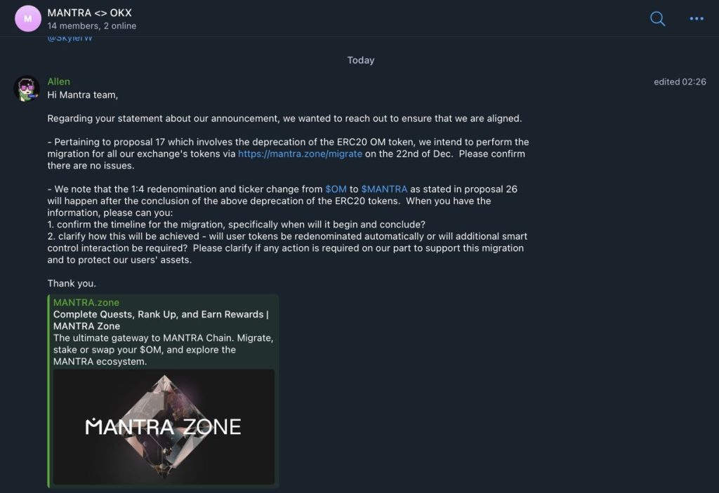 In a follow-up development on the public dispute that emerged between OKX and the Mantra team over the upcoming migration of OM tokens, an OKX representative, identified as Allen, contacted Mantra on Telegram to confirm details of the December 22 migration through the project’s official portal.