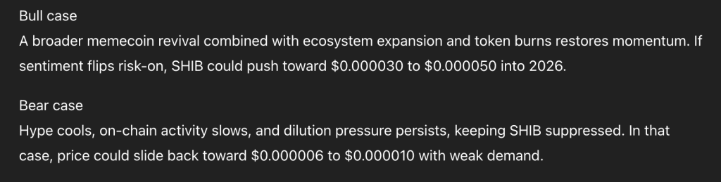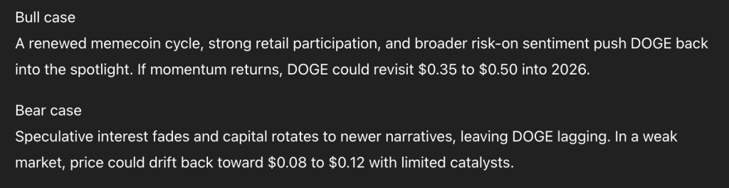 For the Dogecoin bull case, ChatGPT predicts a strong momentum return that could take DOGE to the $0.35 to $0.50 zone heading into 2026, driven by a renewed memecoin cycle and broader risk on sentiment.