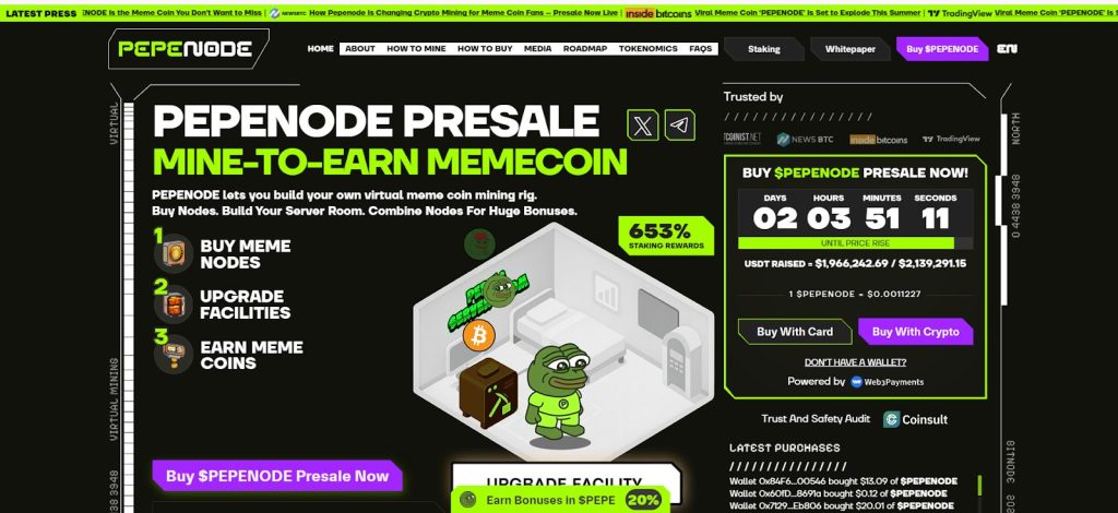 To participate, users buy $PEPENODE tokens, which grant access to meme nodes, the core components of their mining infrastructure.