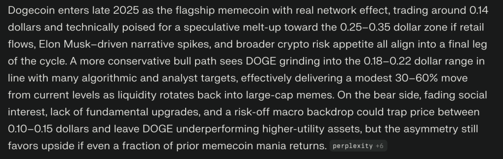 Despite that, Perplexity predicts Dogecoin is due to come back as the flagship memecoin and put a price target of 0.25 – 0.35 by 2026.