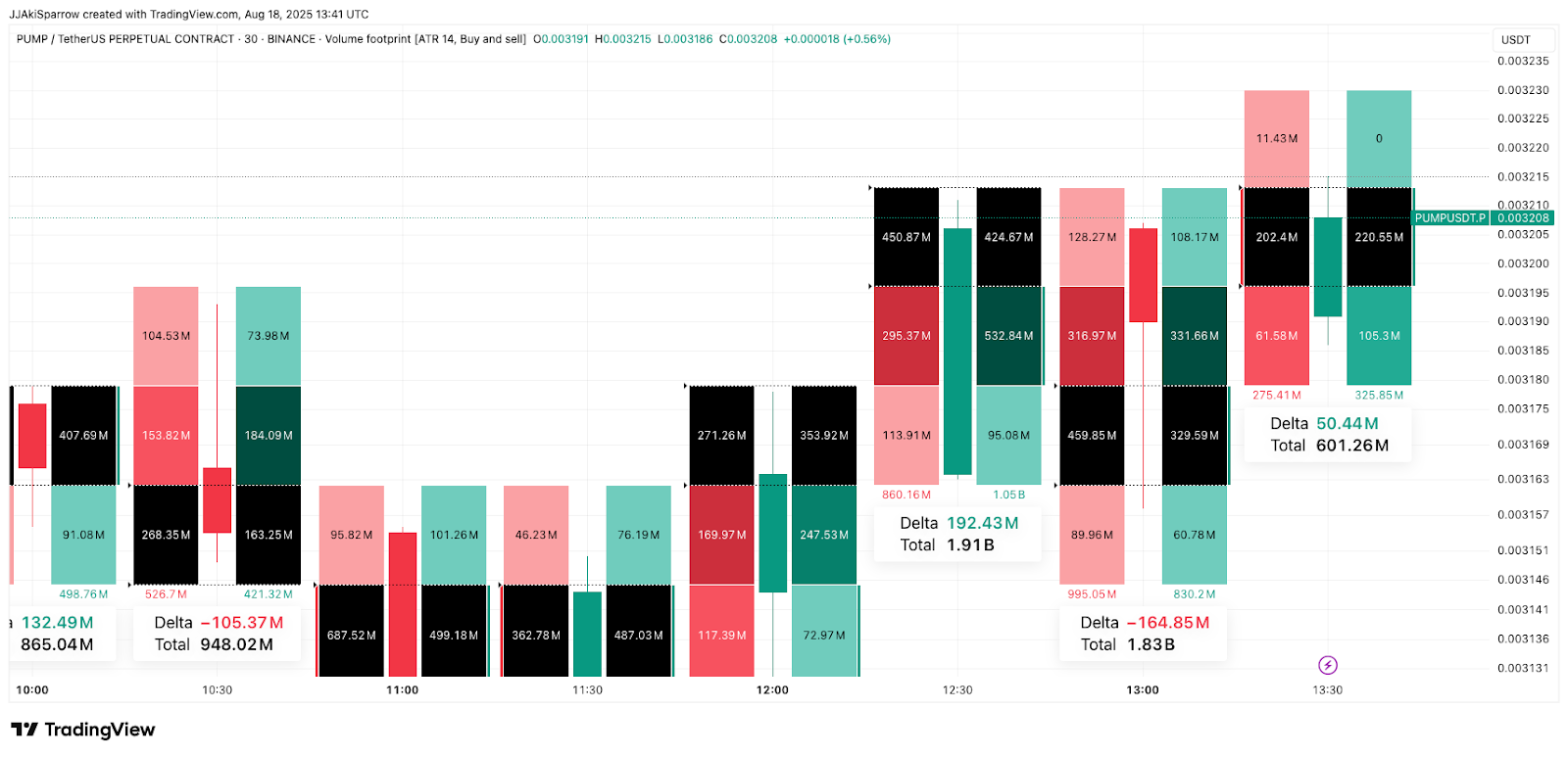 Even during the short-lived uptick after the breakdown, the volume was lopsided: nearly 1.91 billion contracts were exchanged. Nonetheless, the delta remained positive at only +192.43M, suggesting that despite high activity, buyers were not in full control. Subsequent candles also showed falling volume and smaller deltas, confirming fatigue.