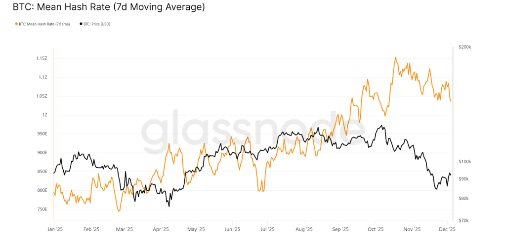 Glassnode data shows total network hashrate has slipped from around 1.1 zettahash per second to just above 1 ZH/s, showing that some miners are already capitulating or curtailing operations.