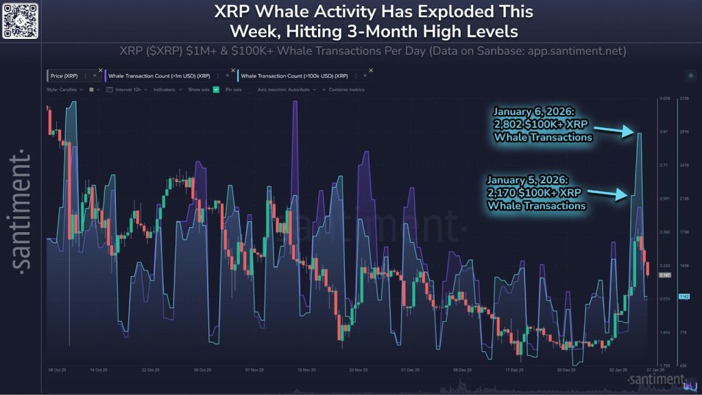 At the same time, Santiment data points to a surge in large XRP transactions, with transfers above $100,000 hitting a three-month high earlier this week, a sign of heightened positioning rather than a clear directional bet.