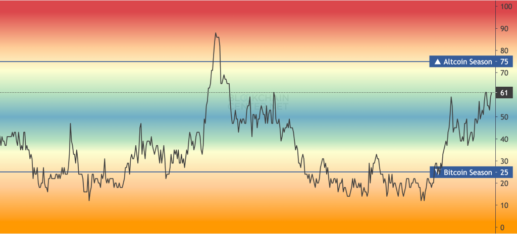 The Altseason Index surged to 61 after months below 55, with full-scale altseason typically beginning at 75.