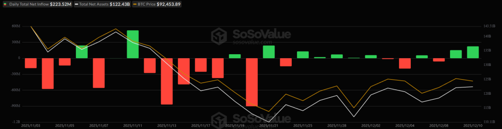 On Wednesday, the US BTC spot exchange-traded funds (ETFs) posted another day of positive flows, with a notable $223.52 million in inflows. The total net inflow increased slightly to $57.93 billion.