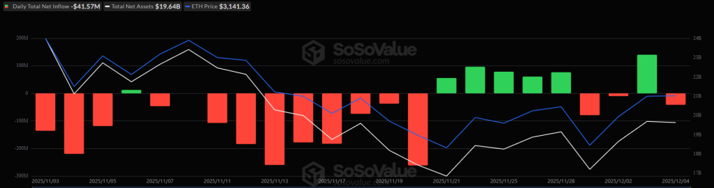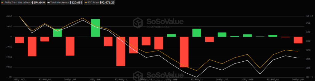 On Thursday, 4 December, the US BTC spot exchange-traded funds (ETFs) saw a second straight day of outflows with $194.64 million. The total net inflow pulled back to $57.56 billion.