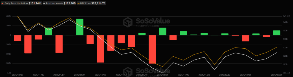 Following a day of outflows, the US BTC spot exchange-traded funds (ETFs) recorded $151.74 million in inflows. The total net inflow now stands at $57.71 billion.