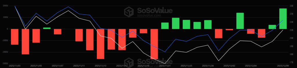 Moreover, the US ETH ETFs posted another day of positive flows on 9 December, with $177.64 million in inflows. This is the highest amount since late October. The total net inflow now stands at $13.09 billion.