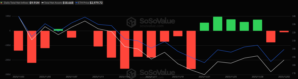 Moreover, the US ETH ETFs saw a second day of negative flows, letting go of another $9.91 million on Tuesday. With this, the total net inflow pulled back slightly to $12.86 billion.