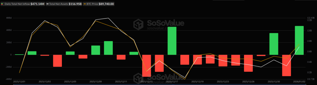 The first trading day of the year, Friday, 2 January, saw the US BTC spot exchange-traded funds (ETFs) posting positive flows of $471.14 million. The total net inflow now stands at $57.08 billion.
