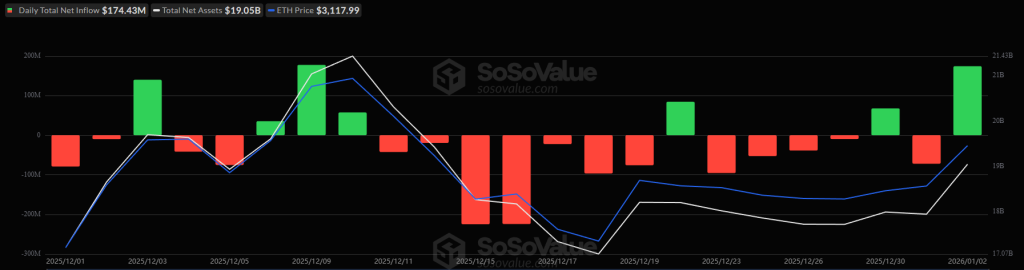 Moreover, the US ETH ETFs also posted positive flows, with $174.43 million on 2 January. The total net inflow hovers around $12.5 billion.