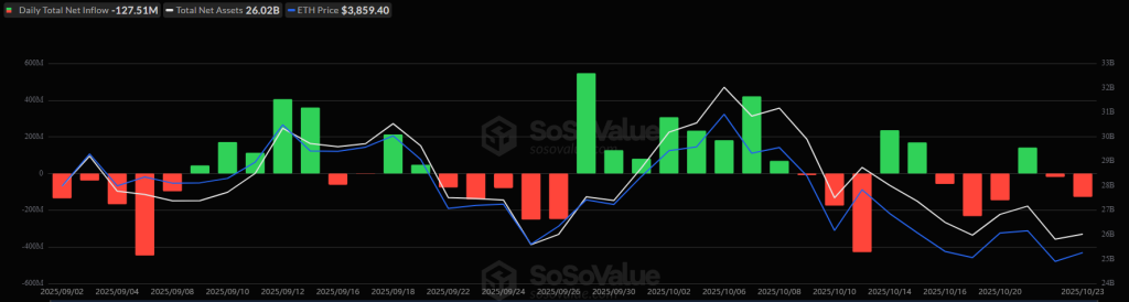 However, the US ETH ETFs saw a second day of outflows in a row on 23 October, with $127.51 million. The total net inflow now stands at $14.45 billion.