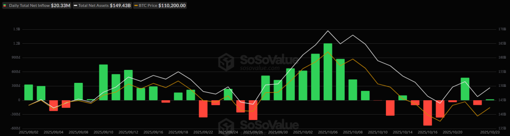 Following a day of outflows, the US BTC spot exchange-traded funds (ETFs) recorded $20.33 million in inflows on Thursday. The total net inflow now stands at $61.89 billion.