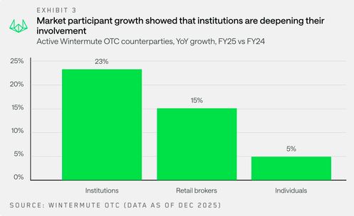 Wintermute saw 23% year-over-year growth among institutional participants, including crypto-native funds, asset managers, and traditional financial institutions.