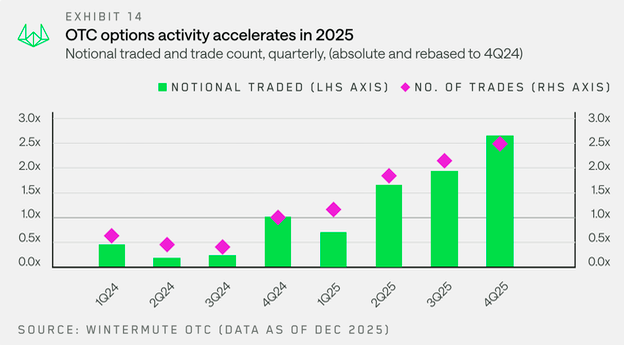 The firm’s derivatives data also reveals options activity more than doubled year-over-year, with systematic yield and risk management strategies dominating flow for the first time rather than one-off directional bets.