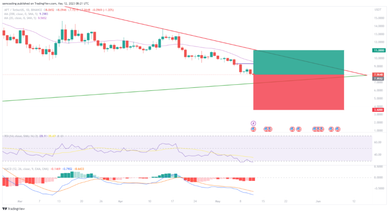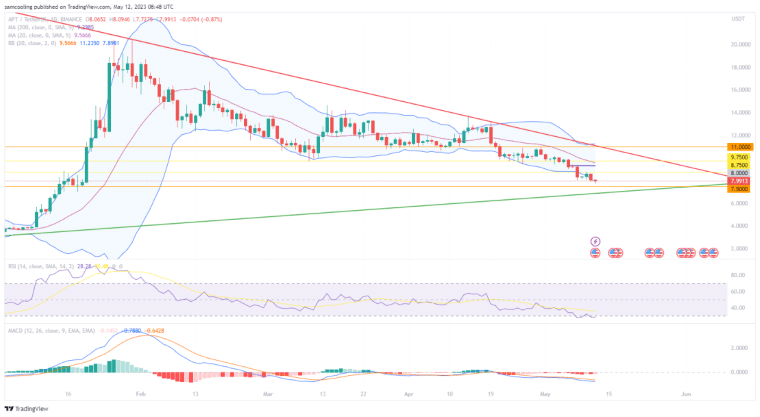 Hoewel Apt er op korte termijn in slaagde de trendlijn vast te houden rond de $8, wist het aanhoudende bearish momentum erin te slagen om de lagere supportpunten te gaan testen.