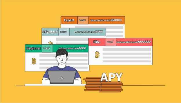 De APY die je verdient op Bitcoin of Euro’s wordt bepaald door je account level. Je account level is afhankelijk van het aantal RBIS dat je bezit. Account levels zijn er van het Beginner level totaal Gevorderde, Expert en Elite. De hoogste levels bieden je de optie om de hoogste rentes te verdienen en zelfs om rente op rente te gaan verdienen waardoor je winsten nog verder toenemen.