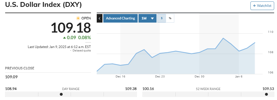 Een belangrijke reden achter de daling van Bitcoin, met name tegenover de waarde van de dollar, is het feit dat dat de Dollar index (DXY) aan het stijgen is. In december lag de index nog op 106, maar vandaag ligt deze zo’n 3% hoger op 109.