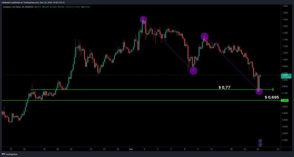 We kunnen zien dat het koerslevel rond $ 0,77 al terug getest is in de recente daling. Het koerslevel daaronder, rond $ 0,695, is nog niet opgezocht en kan wellicht binnenkort bezoek krijgen van ADA bears.