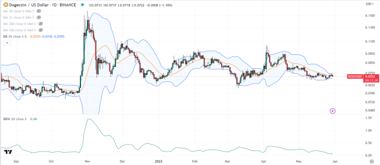 DOGE trade voor het laatst in de buurt van de $0,0725 per token en draait zich om vanaf de 21DMA.