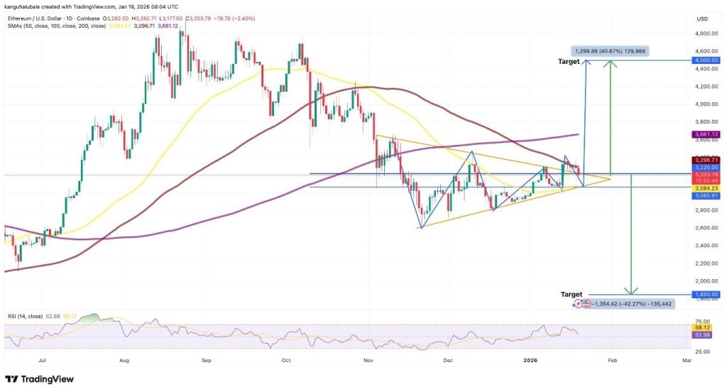 De Ethereum koers werd afgewezen bij de 100-daagse Moving Average (MA) rond $3300 en is inmiddels teruggevallen binnen de symmetrische driehoek, zoals te zien is op de daily.