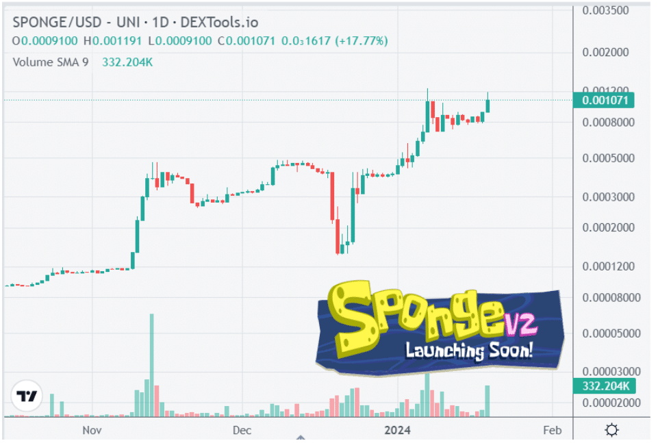 De hype rond Sponge V2 heeft de koers van het originele Sponge token de afgelopen weken aanzienlijk doen laten stijgen.