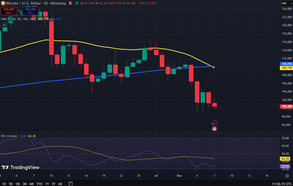 De Bitcoin koers test vandaag opnieuw het niveau van $100.000, een teken dat de verkoopdruk hoog blijft. Maar op het moment van schrijven is het niveau nog niet gebroken. Het blijft daarom een cruciale weerstand voor BTC om te beschermen. Sommigen denken dat de voorlopige bodem al in zicht is voor Bitcoin.