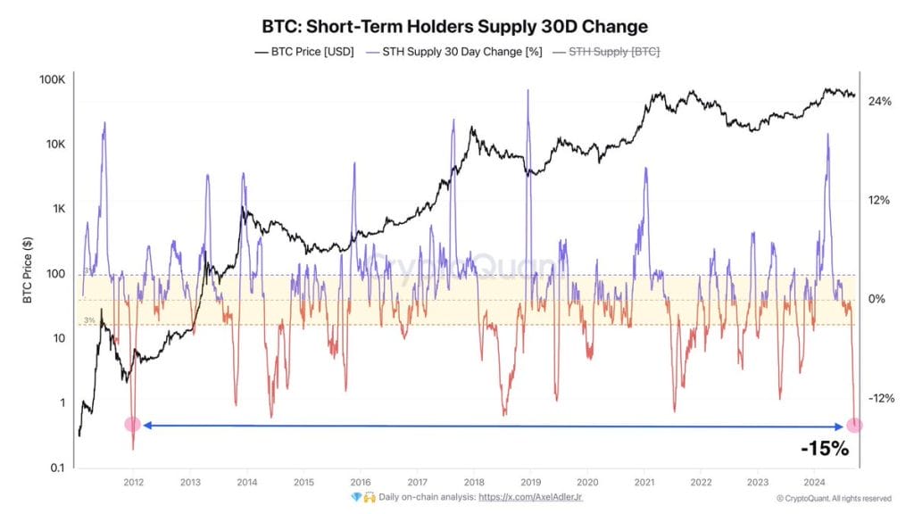 Deze week heeft de markt ook een dieptepunt afgegeven. Momenteel zien we de grootste afname in korte termijn HODL’ers van Bitcoin sinds 2012. Een korte termijn HODL’er is iemand die Bitcoin voor minder dan een jaar vasthoudt.