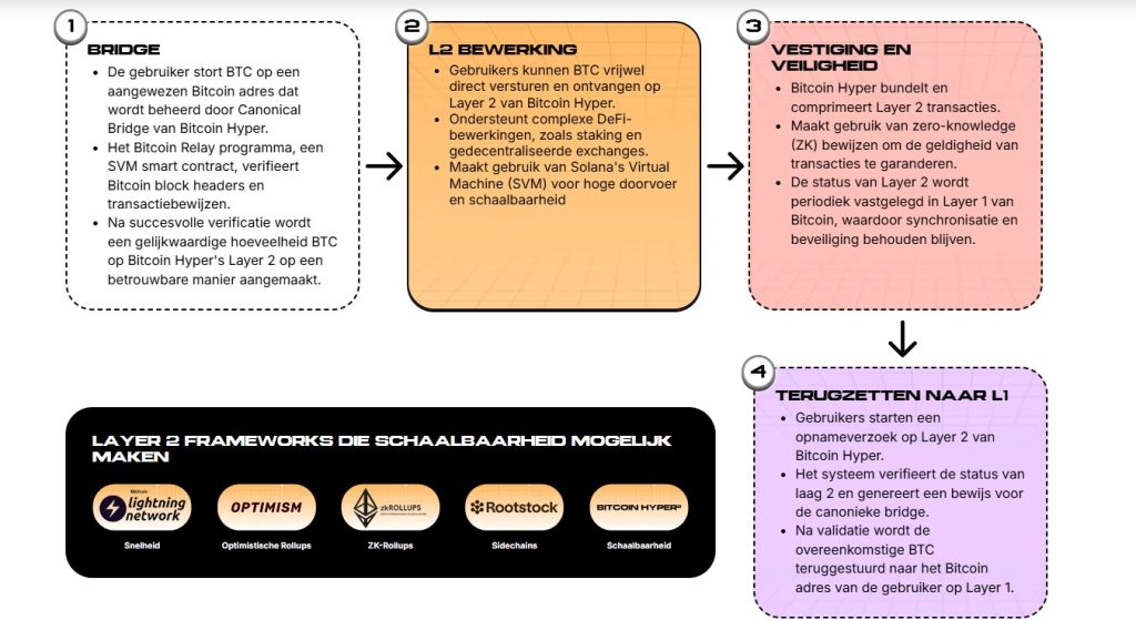 Bitcoin Hyper wil Bitcoin een eigen Layer2 geven, die een bridge vormt naar de Solana Virtual Machine. Hiermee kunnen traders Bitcoin transacties uitvoeren met een snelheid van 65.000 transacties per seconde. Samen met de transactiesnelheid neemt ook de schaalbaarheid van Bitcoin toe, wat ook nog eens zal bijdragen aan lagere kosten.