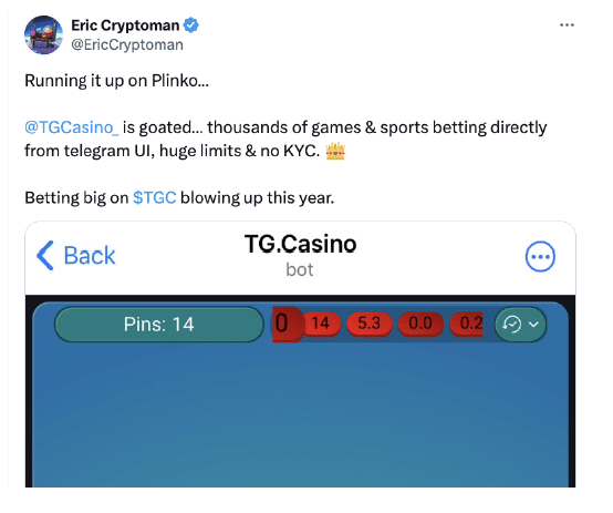 Eric Cryptoman denkt dat TG.Casino enorm groot zal worden en is al vroeg een supporter geworden van het casino. Eric heeft 182.500 volgers op X/Twitter.