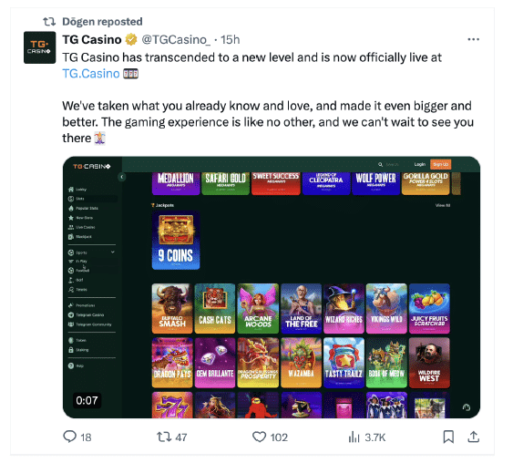 …en hij herpost het grote nieuws dat TG.Casino “tot een nieuw niveau is gestegen” na de lancering van de webversie van zijn casino en sportsbook.