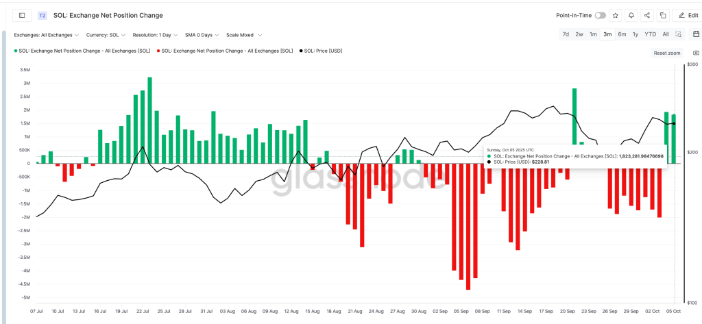 Centrale uitwisselingen lieten de afgelopen dagen een duidelijke verschuiving in token stromen zien. Tussen 3 en 5 oktober veranderde de exchange net position change van -2,01 miljoen SOL naar +1,82 miljoen SOL. Dit betekent dat er meer Solana tokens richting exchanges gingen, wat meestal duidt op winstnemingen door korte termijn traders.