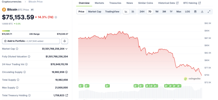 Bitcoin koers daalde daarbij van 87.970 dollar naar 75.892 dollar. Die beweging duwde de koers kort onder het gemiddelde aankoopniveau van Strategy, dat rond 76.040 dollar ligt. De prijs staat momenteel rond 75.000 dollar, waardoor Strategy nu tijdelijk op verlies staat.