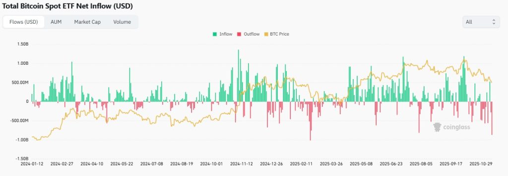 Gedurende 13 november heeft Bitcoin een van de grootste outflows van ETF’s tot dusver gezien met -$866,7 miljoen. Hiermee testen instituten of er genoeg interesse is om de prijs van Bitcoin hier te verdedigen. Als dat niet het geval is, dan wordt de prijs gestaag verder omlaaggedrukt, tot het aantrekkelijk genoeg is voor instituten om opnieuw in te stappen.