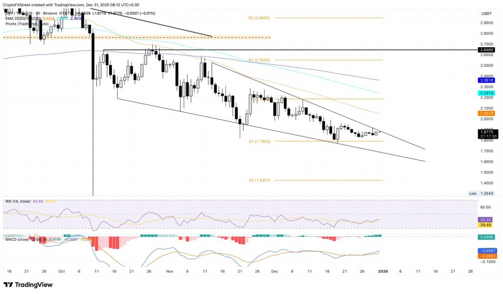 Ripple worstelt momenteel rond een dalende weerstandstrendlijn die de toppen van 13 november en 9 december met elkaar verbindt, rond het niveau van $1,85. Deze trendlijn vormt de bovenkant van een ‘falling wedge’ patroon op de daily, met aan de onderzijde een samenlopende supportlijn die de bodems van 17 oktober en 4 november verbindt.