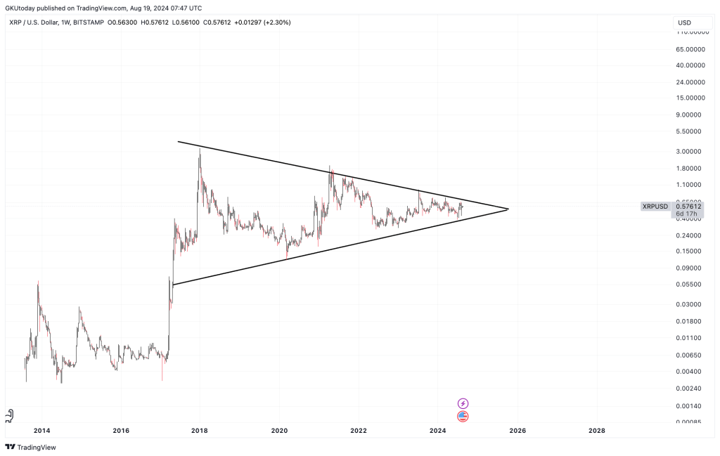 Afgaande op de XRP-prijsgrafiek is er niet veel meer over voordat het patroon is voltooid. Echter, het einde is dit jaar nog niet gekomen en zal waarschijnlijk ook niet in de eerste helft van 2025 komen.