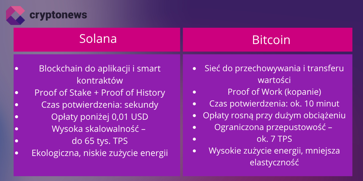 Choć Bitcoin i Solana funkcjonują w tym samym świecie kryptowalut, ich cele są zasadniczo odmienne. Bitcoin został zaprojektowany jako cyfrowa alternatywa dla złota – zdecentralizowany system przechowywania i transferu wartości, którego siłą jest prostota i bezpieczeństwo wynikające z Proof of Work.