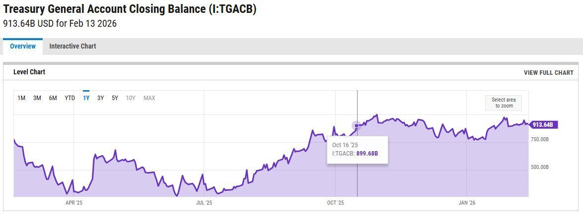 Hayes nie bawi się w subtelności i przedstawia konkretne wyliczenia. Saldo TGA oscyluje obecnie w granicach 750 miliardów dolarów, podczas gdy wytyczne skarbu wskazują na cel w okolicach 450 miliardów dolarów. Sama ta różnica sugeruje, że w wyniku redukcji salda do systemu powróci około 301 miliardów dolarów.