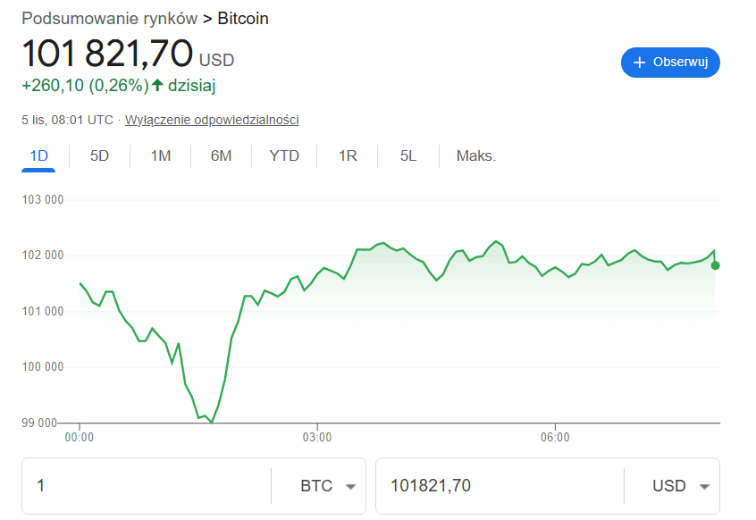 - Bitcoin spada chwilowo poniżej 100 000 USD, osiągając minimum w okolicach 99 000 USD; obecnie odbił do poziomu 101 821 USD.
