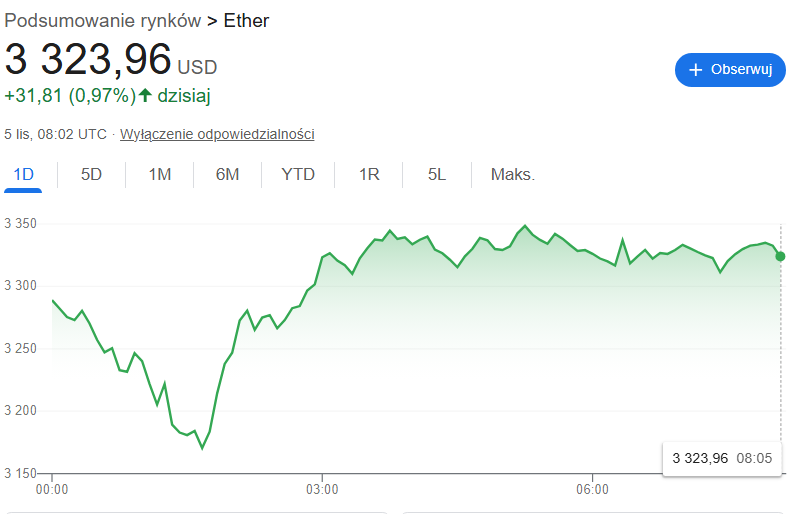 - Ethereum potaniało do 3055 USD, po czym częściowo odrobiło straty i kosztuje około 3321 USD.