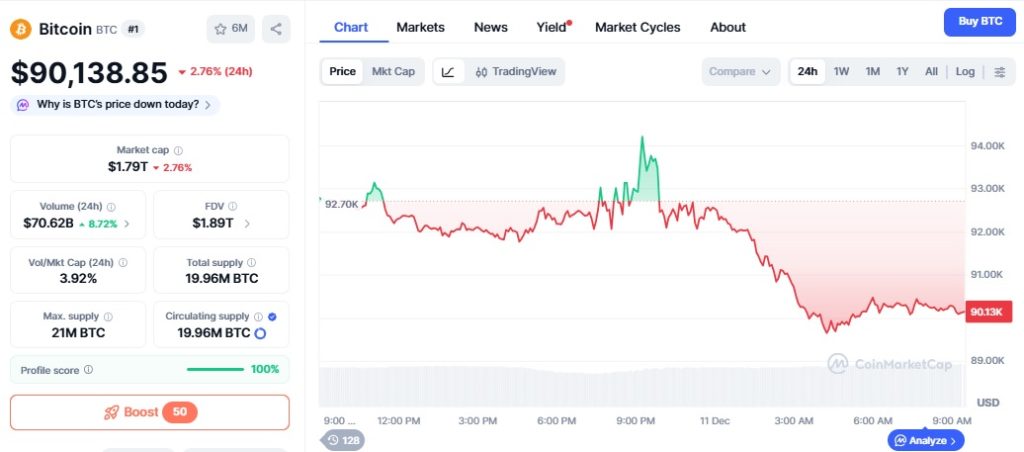 Cena BTC spadła pod 90 tysięcy dolarów. Spadek nie jest dramatyczny, ale wybija z rytmu po kilku nieudanych próbach wejścia nad 94 tysiące.
