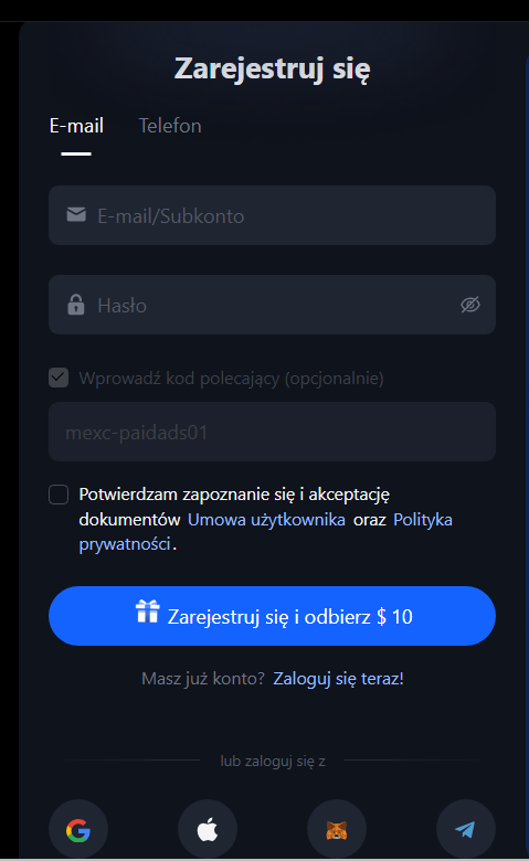 - Wejdź na oficjalną stronę MEXC i zarejestruj nowe konto.